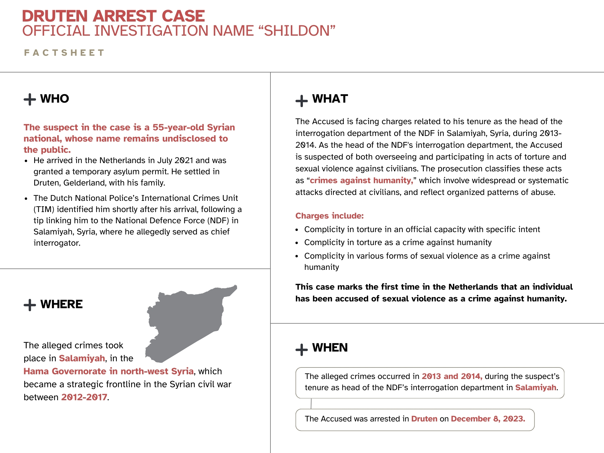 The fifth pre-trial hearing in the Druten case was held on February 17, 2025, at the District Court of The Hague. The accused, who remains in pre-trial detention on charges related to international crimes allegedly committed during the Syrian conflict, was present during the hearing.