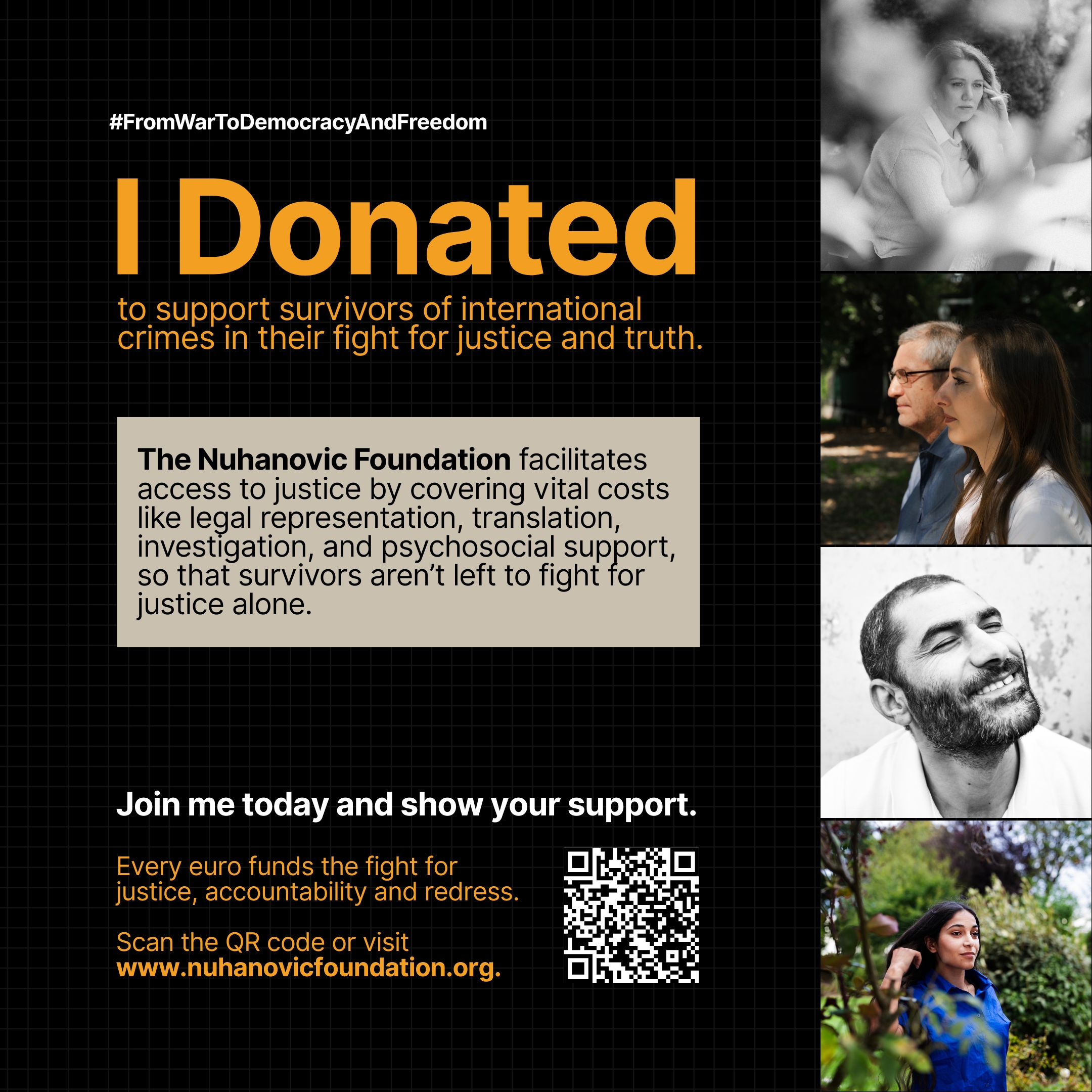 I’m supporting The Nuhanovic Foundation’s campaign Justice: From War to Democracy and Freedom, which helps survivors of international crimes access justice and accountability.